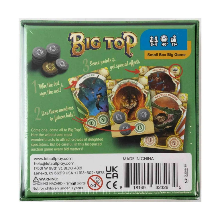 Hire the wildest and most wonderful acts to attract crowds of spectators. In this fast paced auction game you’ll be bidding on show-stopping acts for your Big Top to draw in the crowds. Beware - each winning bid will make your competition that much richer. Even the attractions you’ve already won will affect bids in future auctions. For those attractions to score, fill in all their circles by bidding specific amounts in future auctions.