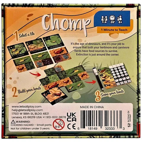 Regular price $19.99The era of the dinosaurs is here! Your goal in Chomp is to form herds of dinos and make sure they are all fed. Herbivores and carnivores both need food sources, but if the carnies are not properly fed, they don't mind chomping an herbie to fill their bellies!
