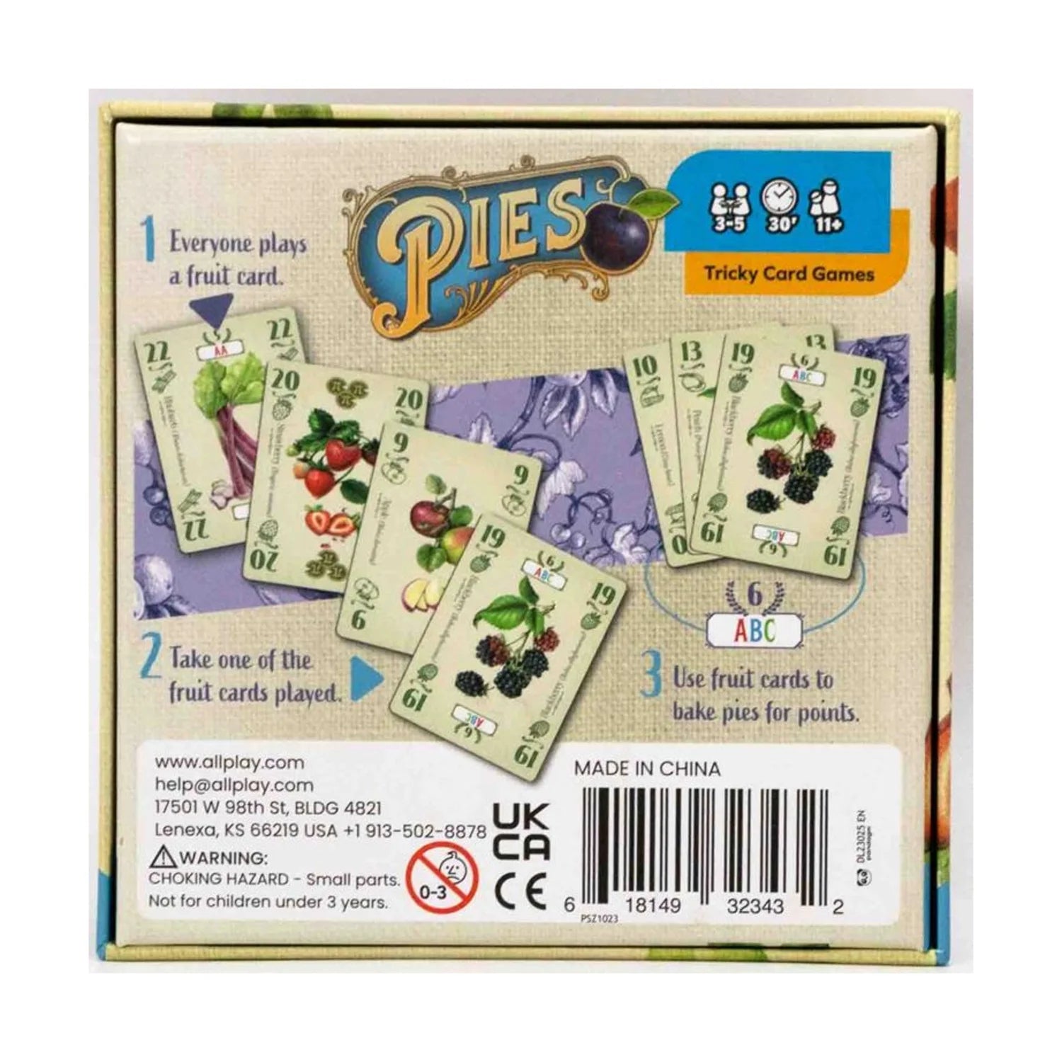 Pies is a quick and tasty trick-taking game in which players play fruit cards over the course of three rounds with the goal of collecting combinations of ingredients to prepare the tastiest pies