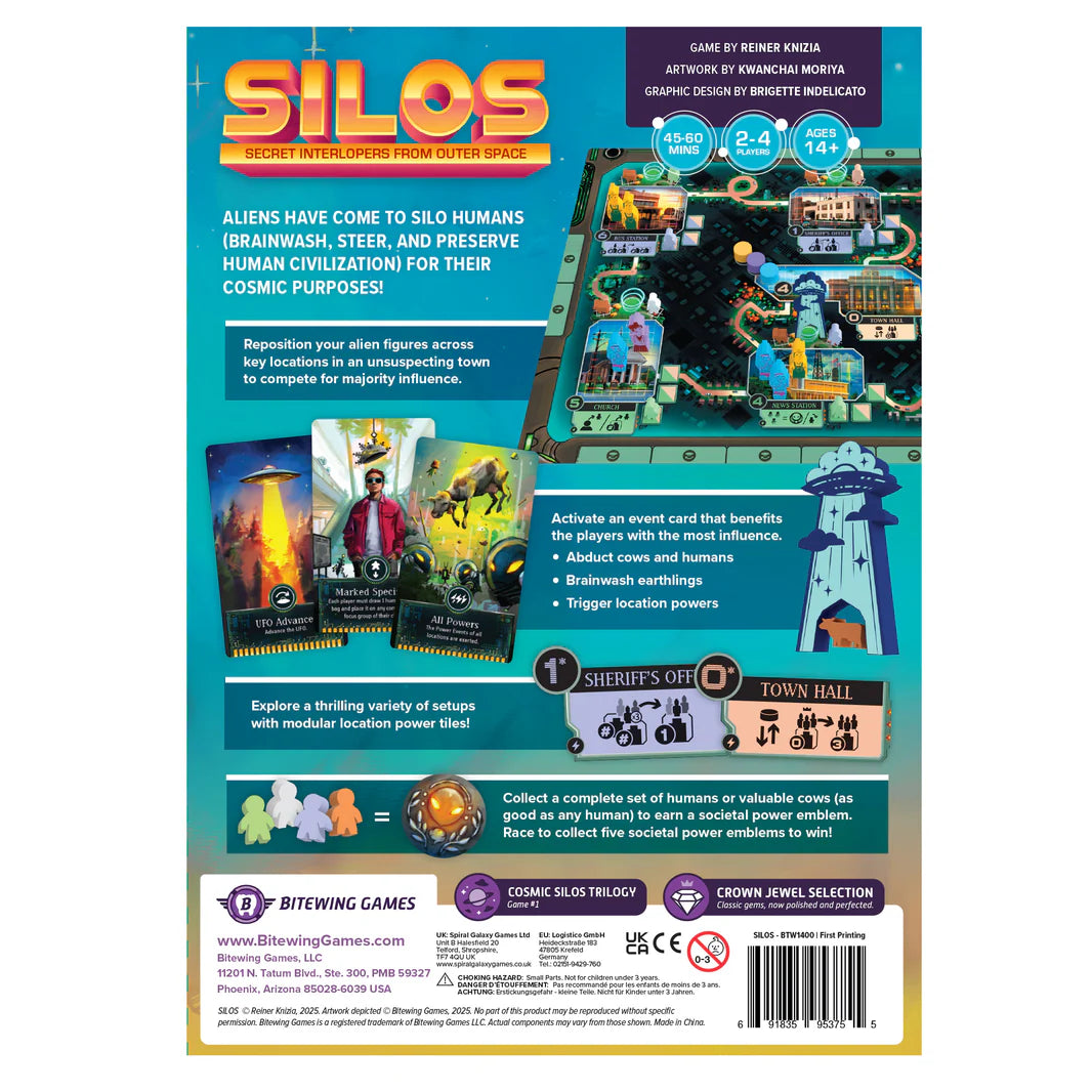 Regular price $54.99Aliens have come to silo humans — brainwash, steer, and preserve human civilization — for their cosmic purposes! In SILOS (Secret InterLopers from Outer Space), players control competing factions of aliens who abduct and brainwash humans and cows while secretly invading their community. Players tussle for majority influence in the key locations of this small town as they seek to activate location powers and control human specimens for societal power.