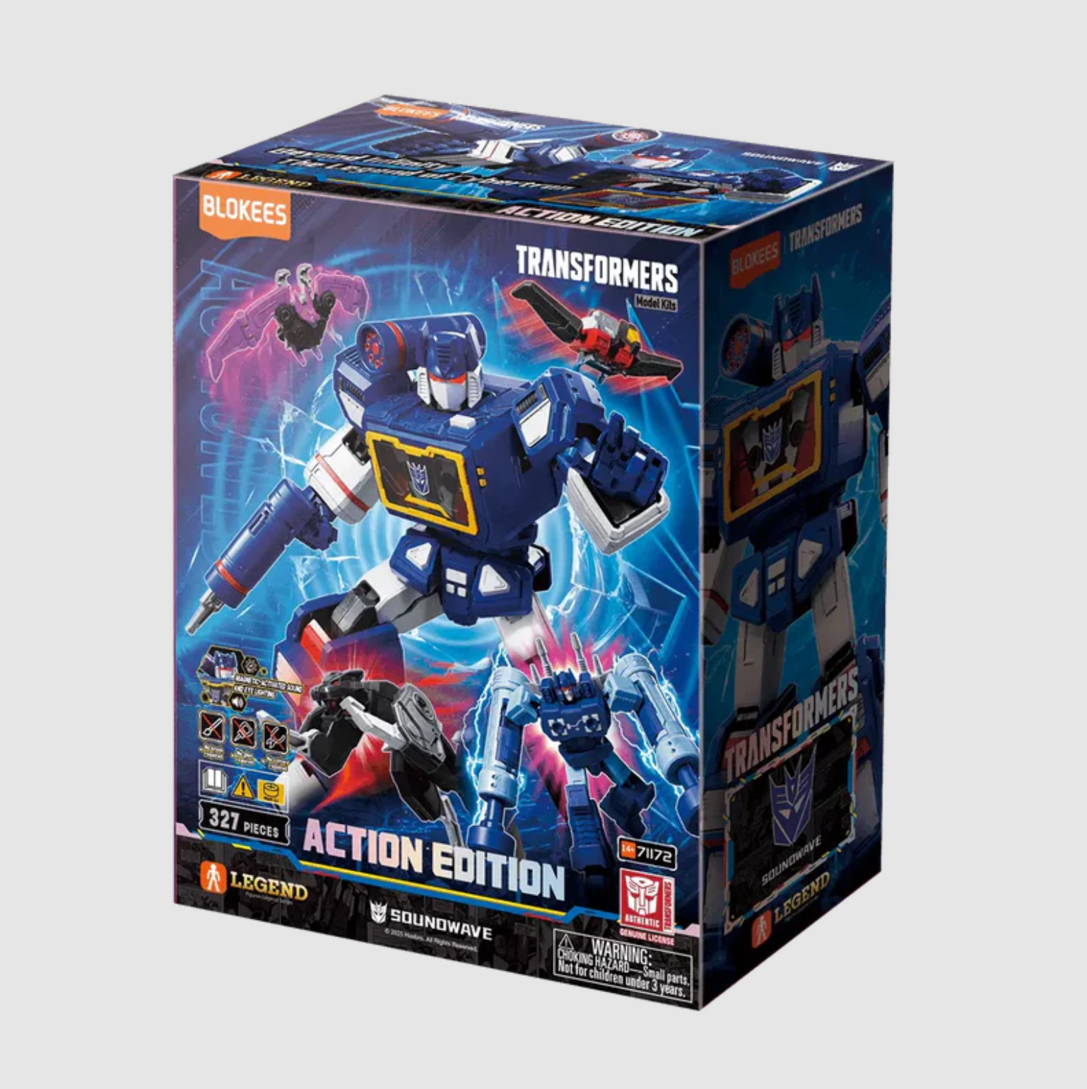 Blokees Action Edition 03 Soundwave Transformers toy features 327 pieces with magnetic-activated sound and lighting that plays iconic voice lines with glowing eyes--no tools required.