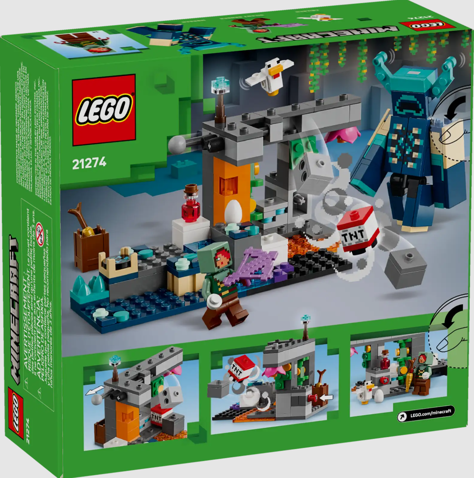 - Minecraft® toy figures – This LEGO® set includes a Minecraft Silent Ranger minifigure, a Minecraft chicken and a large, buildable Minecraft Warden toy with posable head, arms and legs